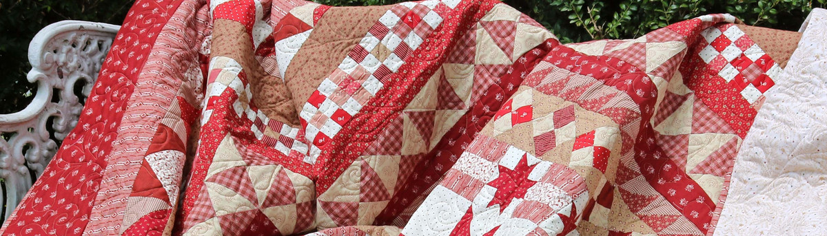 Red Robin quilt (designed by Sheryl Johnson, using Repro Reds fabric collection from Marcus Fabrics) on a garden bench outside. A quilt like this would make a great heirloom quilt for a wedding gift or anniversary.